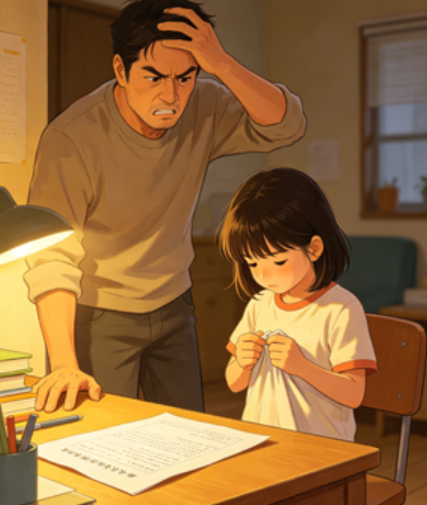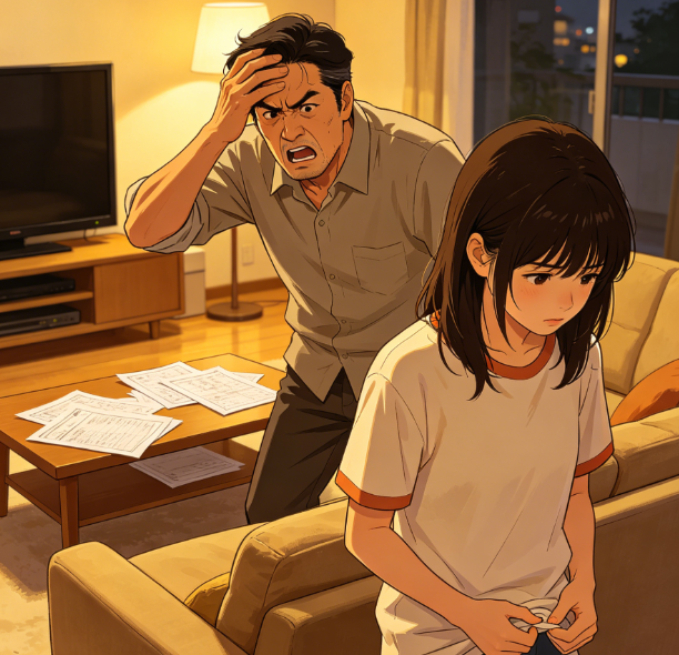 爸爸瞬间瞪圆了眼睛,手猛地拍在茶几上,杯子都震得晃了晃。他深吸一口气,胸口剧烈起伏,指着女儿半天说不出话,脸憋得通红,差点没背过气去。女儿吓得赶紧拉着爸爸的衣角,小声辩解:"爸爸,不是我不努力,这次题目太难了,我真的尽力了。"