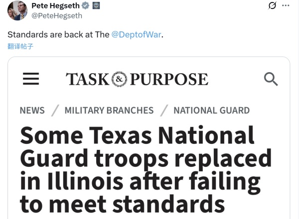 此后,得克萨斯州军事部门的发言人也向美国军事新闻网站"任务与目的"(Task & Purpose)透露,在部署至伊利诺伊州的200名国民警卫队士兵中,"一小部分人"因未达到特定标准已被替换。但该部门拒绝透露涉及的具体部队、人数和原因。