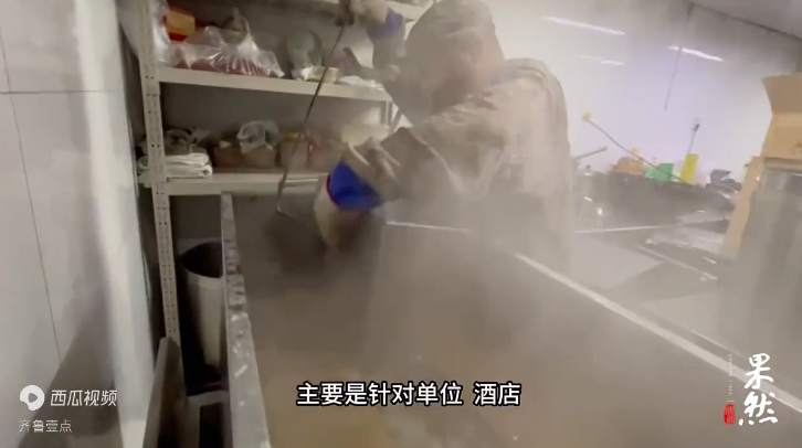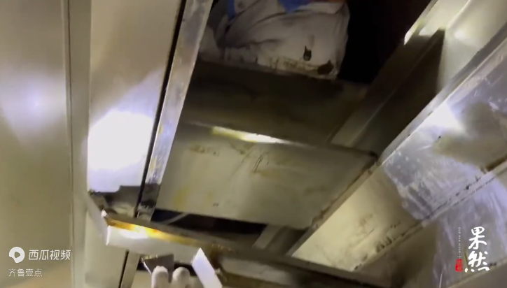 44岁的李爱中从事油烟机管道清洁工作已有10年,这项工作无法用机器操作,只能由人工用铲刀一点点清理。烟机管道口通常只有40厘米左右宽,人需要钻进狭小的空间,用铲刀将老油铲掉,然后喷洒火碱水将缝隙内的油污分解,再用高压水枪冲洗。