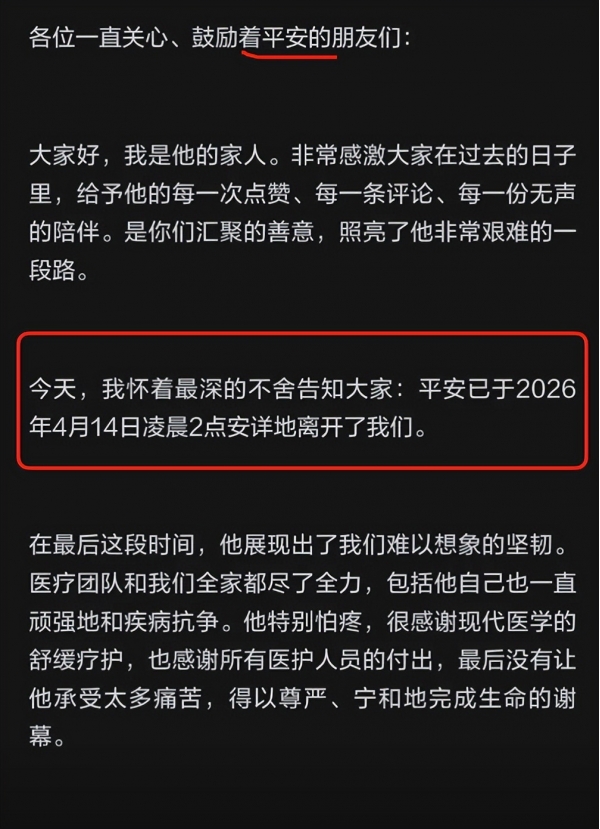 说实话,得知他离世的消息,我没有太多的意外,反而生出一丝心疼的释然--对于被癌症纠缠了一整年的他来说,离开或许不是遗憾,而是真正的解脱。