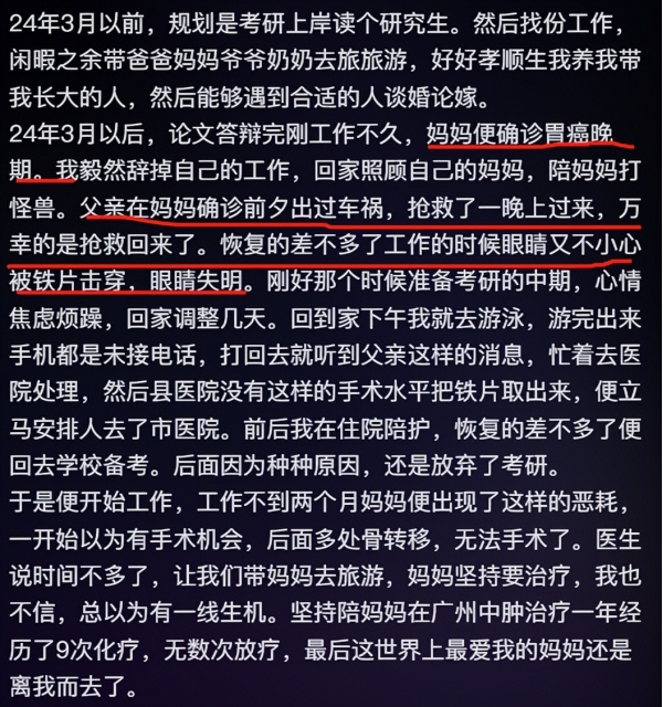 短短几年间,他先后失去了妹妹和妈妈两位至亲,自己又患上癌症,一边抗癌,一边要赚钱养活失明的爸爸、供弟弟读书,就连自己梦寐以求的考研之路,也只能无奈放弃,只为扛起这个千疮百孔的家。