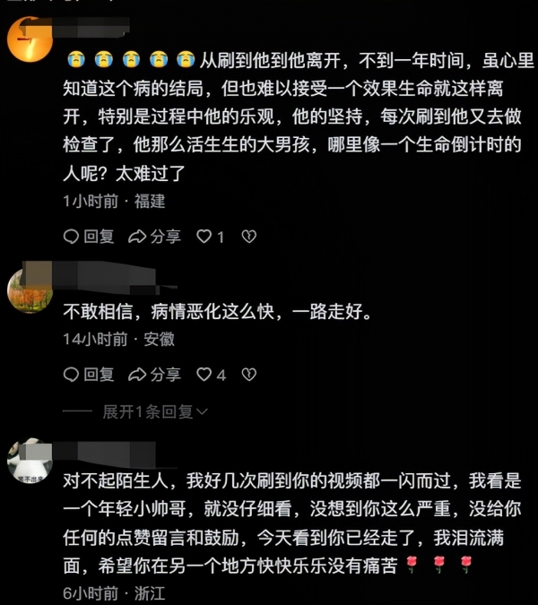 临终前,他特意叮嘱家人,不要删掉自己账号里的所有内容,还牵挂着那些和他一样在与病魔抗争的网友,一遍遍叮嘱大家,一定要撑下去,每个人的处境不同,千万不要轻易放弃自己的生命,再难也别认输。