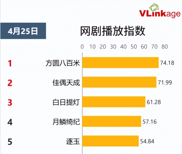 截止发文时间,从"Vlinkage"数据显示可知,当前热播网络电视剧中,播放中指数排行榜前五分别如下:
