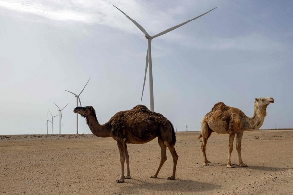 2025年5月26日,西撒哈拉达赫拉,骆驼在风力涡轮机旁游荡,这些涡轮机将为正在建设的海水淡化厂提供电力。视觉中国 资料图