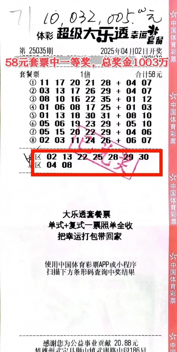 这对楚雄夫妻中的可是体彩大乐透第25035期1003万头奖,用的正是体彩去年刚推出的58元套餐票。