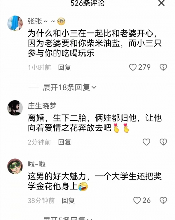 女大学生的奖学金本来是供自己上学的,结果拿去给他花。他家里老婆为生计发愁,还要准备生孩子,哪有钱乱花。男的可能觉得现在感情新鲜,但以后新鲜感没了照样会找别的理由出轨。