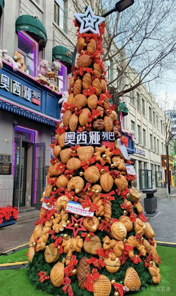 近日,哈尔滨中华巴洛克历史文化街区一面包店门前,一棵由大列巴面包装饰的圣诞树在网络走红。不少游客拍到麻雀等小鸟在树上啄食面包的温馨画面,引发网友感叹,小鸟实现了"面包自由"。