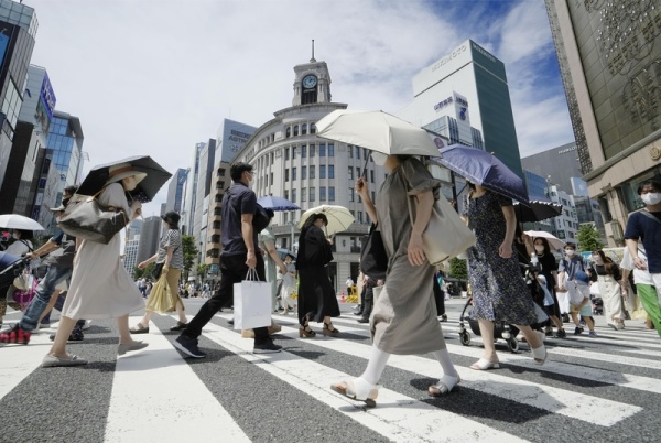东京银座街头的通勤者打阳伞出行。 IC Photo