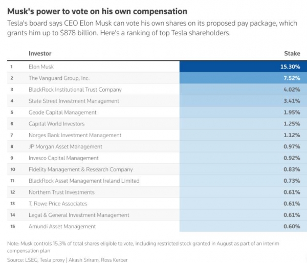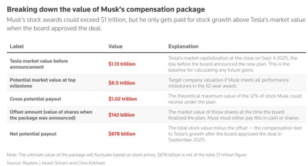 如果马斯克达成所有目标,他将有资格获得12%的股票,价值约1万亿美元。但薪酬方案的真实价值为8780亿美元,因为董事会希望只为马斯克增加的公司价值付费。该方案的结构是向马斯克提供价值1万亿美元的股票,减去董事会9月初通过提案当日的股票价值。马斯克可以选择支付现金或接受较少股份以抵消原始价值。