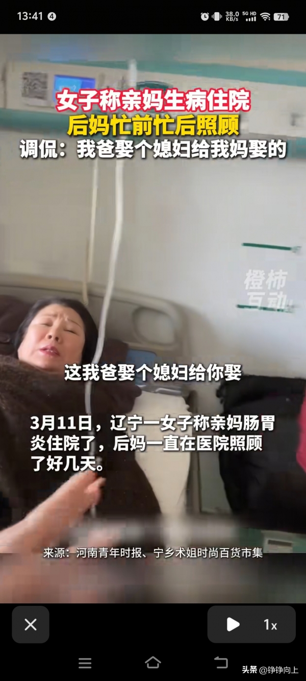 辽宁女子分享视频说,亲妈得了肠胃炎需要住院,自己要上班没办法全程照顾。于是后妈主动请缨,接过照顾老公前妻的任务,连续好几天都忙前忙后,照顾得无微不至。