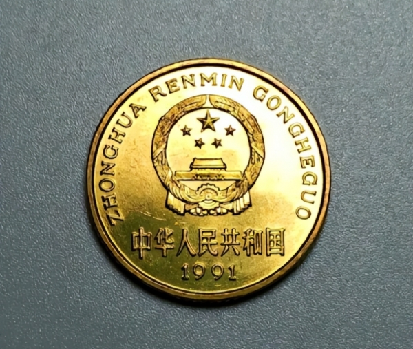 梅花五角自1991年至2001年共发行了11个年份,表面为明亮的黄铜材质,正面是国徽,背面一朵盛开的梅花,寓意坚韧与不屈,象征改革开放时期国家经济的蓬勃生命力。设计上简洁大方,既有传统韵味,又有现代感。