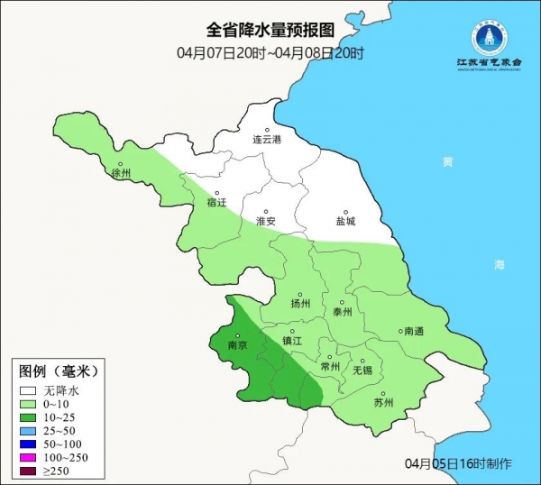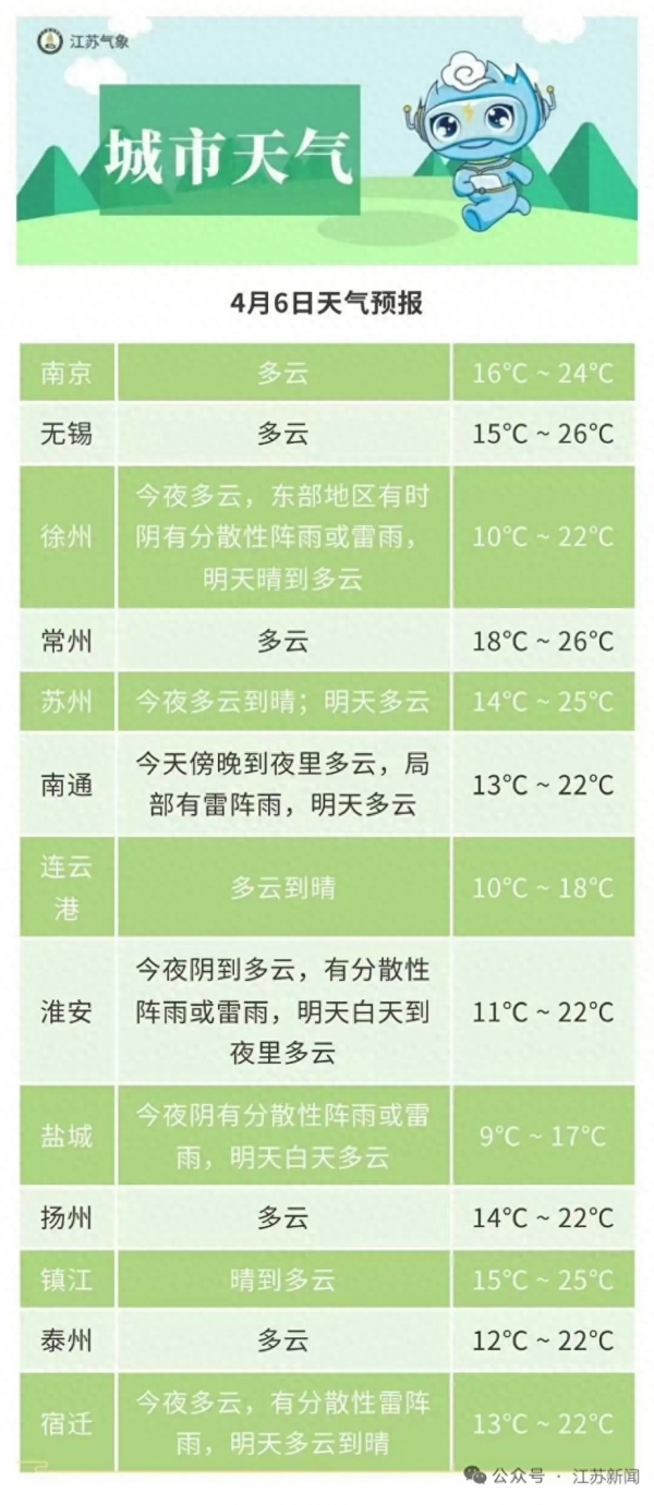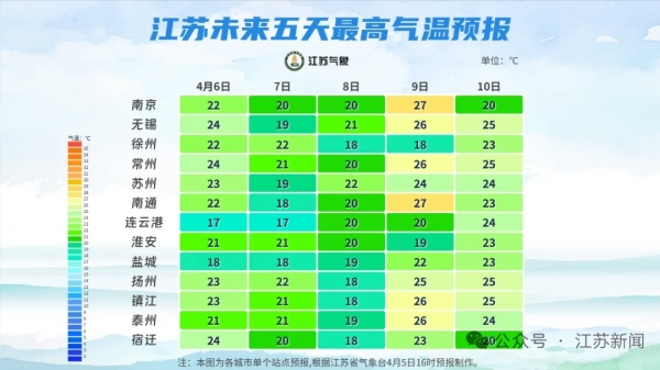 下面是江苏气象部门发布的4月6日至4月8日具体天气预报: