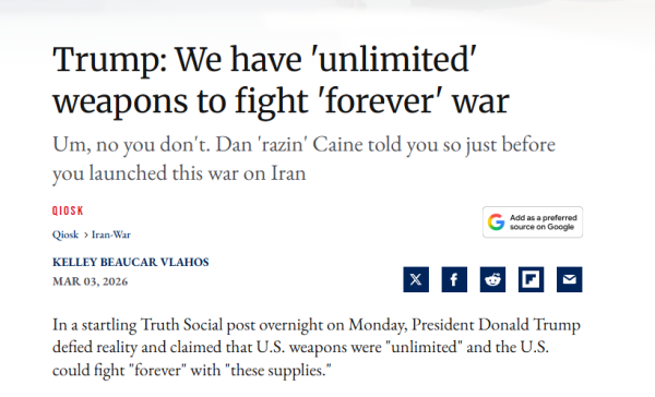 安德鲁・纳波利塔诺:我们昆西研究所的朋友带来了一则新闻标题--特朗普总统称 "我们拥有无限武器,足以打一场永无止境的战争",但事实并非如此。就在美国对伊朗发动这场战争前,丹・凯恩将军已经指出了这一点。特朗普真的这么消息不灵通、被傲慢驱使以至于不明白我们的武器并非无限,甚至供应短缺?