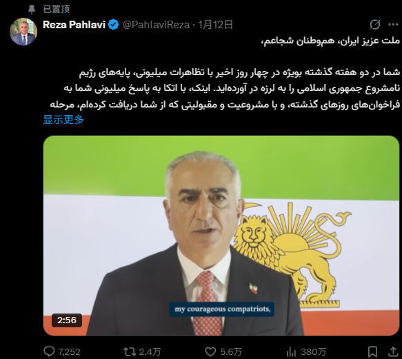 巴列维频繁煽动伊朗骚乱 推文截图