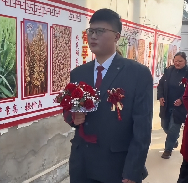 他来接亲时,穿着一身板正的西服,打着红领带,戴着眼镜,看起来斯斯文文、老实本分。