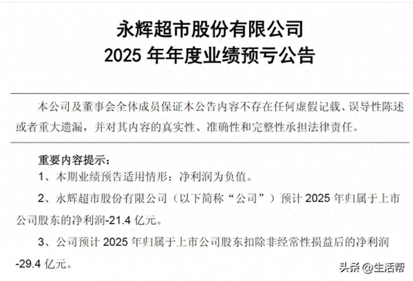 1月20日晚间,永辉超市发布2025年业绩预亏公告,经财务部门初步测算,公司2025年归属于上市公司股东的净利润-21.4亿元,归属于上市公司股东扣除非经常性损益后的净利润-29.4亿元。