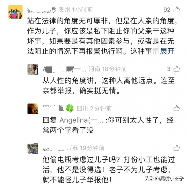了解情况后的交警现场对该男子的父亲进行了一番教育,他苦口婆心地劝说道:你儿子都在举报你说"我爸在偷电瓶",你真的很失败,在我的角度你是很失败的……
