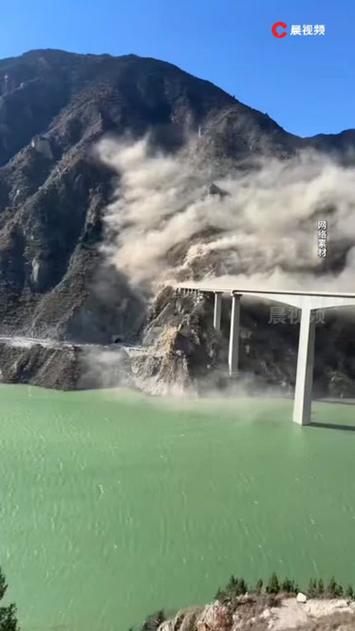 现场拍摄的视频画面显示,随着连续的巨响声,架设在河面之上的公路桥梁靠近山体一侧的结构率先断裂,桥体部分构件迅速坠落,现场升起大量烟尘。与此同时,镜头外传来人员的惊呼声 "桥没得了"。