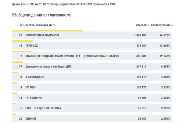 保加利亚中央选举委员会已统计超过98%的选票,"进步保加利亚"以44.7%的得票率排在第一位。英国《卫报》指出,这意味着,拉德夫领导的政党联盟有望赢得保加利亚国民议会240个议席中至少130个,控制议会半数以上的席位。