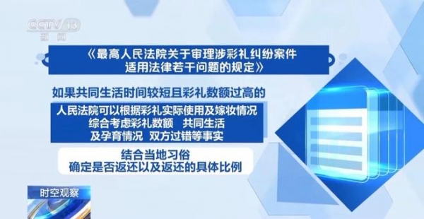 法律专家 岳屾山:最高人民法院今天发布了涉彩礼的典型案例,进一步明确了彩礼返还的裁判标准,也具有一定的、重要的社会引导意义。在这次的案例当中,司法审判不再是简单地以是否办理结婚登记作为评判标准,或者是唯一的评判标准,而是转向了更加实质性的审查。