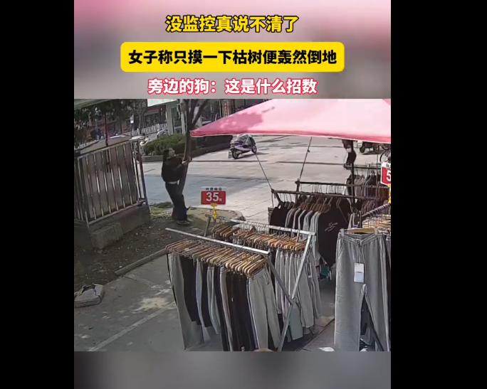 从监控画面里能清晰看到,事发在一处街边的服装摊旁,一棵看起来已经完全干枯的树木立在路边。一名女子走到树旁,似乎只是抬手倚靠、轻轻触碰了树干,下一秒,原本 "纹丝不动" 的枯树,就像被按下了 "倒塌开关",带着巨大的声响直直倒了下去,惊得女子连忙后退躲闪。