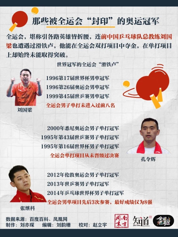 前中国乒乓球队总教练刘国梁,虽然在世界杯、奥运会、世乒赛上实现男单"大满贯",却从未进入全运会男单前八。同样完成"大满贯"伟业的张继科,三战全运会男单项目,最佳成绩也仅止步于八强。