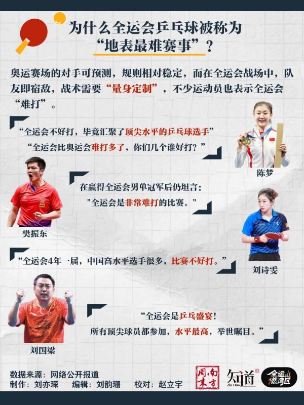 与奥运赛场相比,全运会的乒乓球竞争环境更为复杂。奥运对手可预测、规则相对固定;而在全运会上,队友即是宿敌,省队之间的较量毫不留情,参赛选手个个实力强劲、打法多样,比赛充满不确定性。