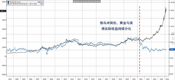 黄金此前上涨更多反映市场对去美化趋势的强化。黄金走势与实际利率走势出现大幅背离。随着战略储备配置叙事的短暂降温,黄金回归传统的避险定价框架,实际利率因此再度成为影响金价的关键变量。