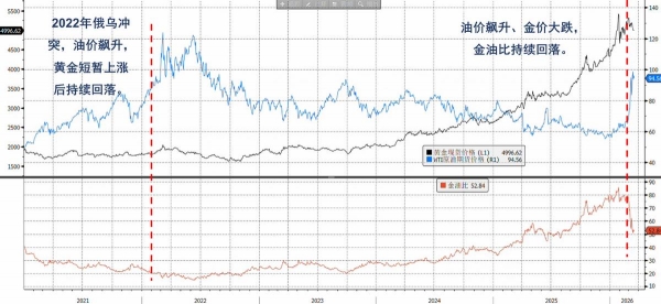 从传统经验看,地缘政治冲突往往推升黄金危机溢价。然而,在本轮中东冲突中,黄金表现明显钝化,并未充分发挥避险属性。核心原因就是战争对于油价的影响,将会传导到利率和实体经济,黄金反而承受了风险资产的压力。