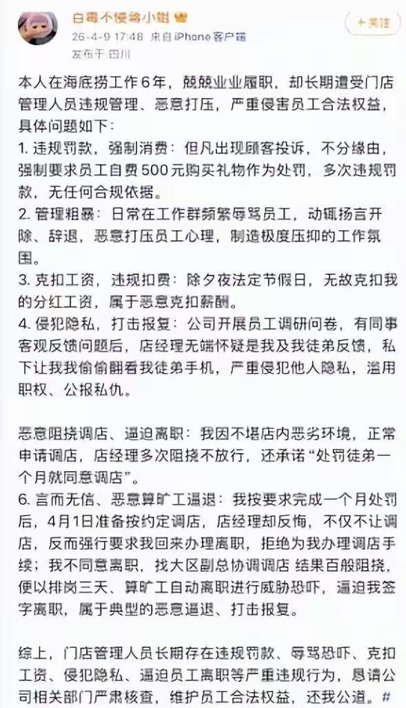 4月9日,在微博有网友就爆料。这位网友表示自己在海底捞工作了6年,一直非常努力的工作。但是门店的管理人员,却恶意对他进行打压,导致他没有办法正常工作。所以气不过的他,这才在网上曝光了这件事情。这一次的话,他一共指出了4个点。分别是违规罚款,管理粗暴,克扣工资和侵犯隐私。