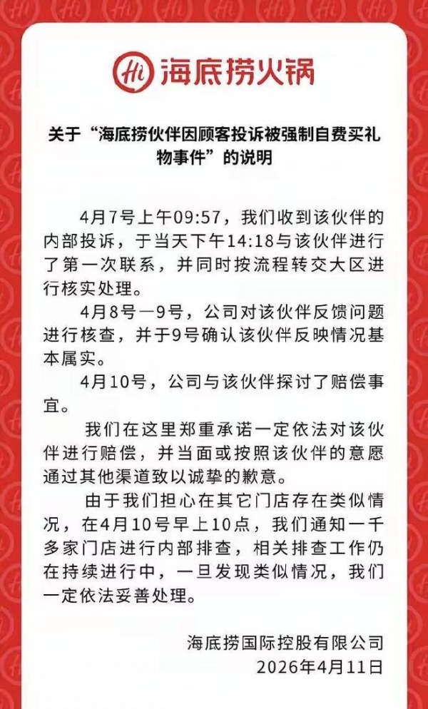 这不这件事情曝光之后,海底捞那边也介入了此事。现在的话,海底捞也发出通报回应了这件事情。海底捞告诉我们,经过调查,情况基本属实。为了不让其他的员工遇到这种情况,他们已经对一千多家门店进行了自查。如果发现有这种情况,那会立即处理。同时员工也可以进行举报,到时候肯定会进行处理。