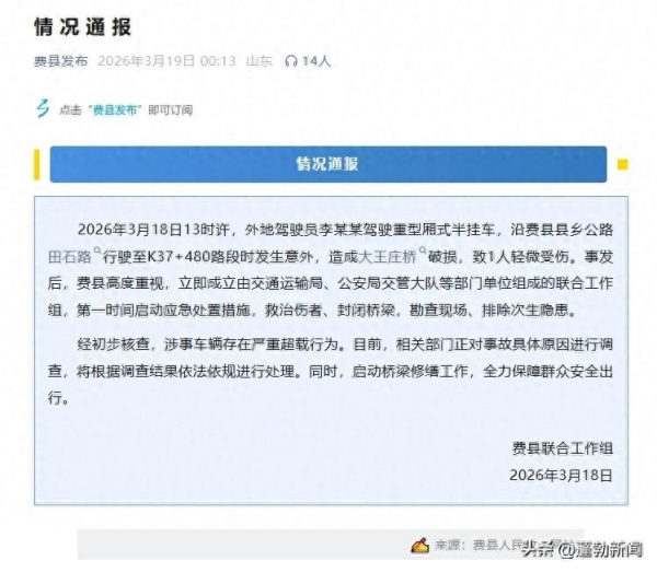 3月18日13时许,外地驾驶员李某某驾驶重型厢式半挂车,沿费县县乡公路田石路行驶至K37+480路段时发生意外,造成大王庄桥破损,致1人轻微受伤。事发后,费县高度重视,立即成立由交通运输局、公安局交管大队等部门单位组成的联合工作组,第一时间启动应急处置措施,救治伤者、封闭桥梁,勘查现场、排除次生隐患。