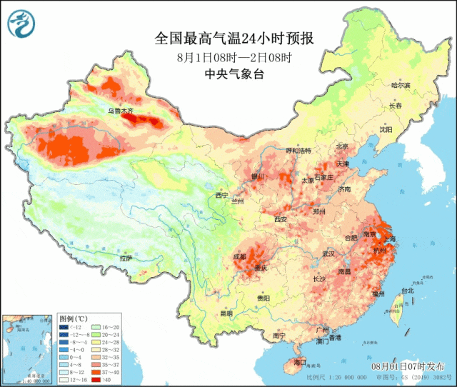 根据中央气象台预报,未来数日,我国的高温将发展增强,呈现"东蒸西烤"的天气格局:中东部地区从华南地区一直到黄淮地区昼蒸夜煮,新疆等地则持续高温天气,部分地区40℃不下线,。其中,江淮、江汉、江南一带在未来一周内高温持久,尤其是本轮高温的核心区域江浙沪一带,部分地方最高气温可能接近或达到40℃,再加上湿度大,体感闷热,犹如蒸桑拿。