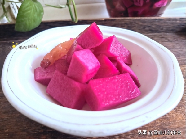 1,把白萝卜洗净切成块,紫甘蓝洗净切块晾干表面的水分,放到密封罐中,加入泡野山椒、盐、花椒、生姜浸泡大约3天。