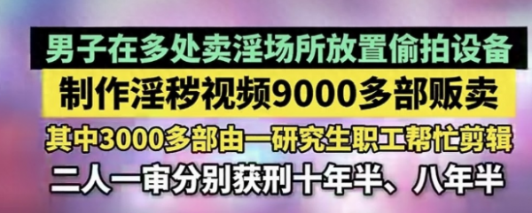 研究生剪辑3千多部卖淫偷拍视频被判刑。湖北男子欧某,三年里在卖淫场所偷偷装摄像头,拍了9000多部淫秽视频拿去卖;更让人意外的是,其中3000多部的剪辑师叶某居然是武汉某研究院的研究生。最后法院一审判决,欧某10年6个月,叶某8年6个月,俩人各自就赚了5万多块钱。
