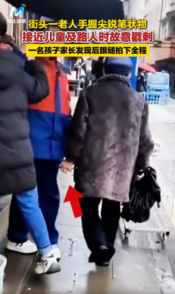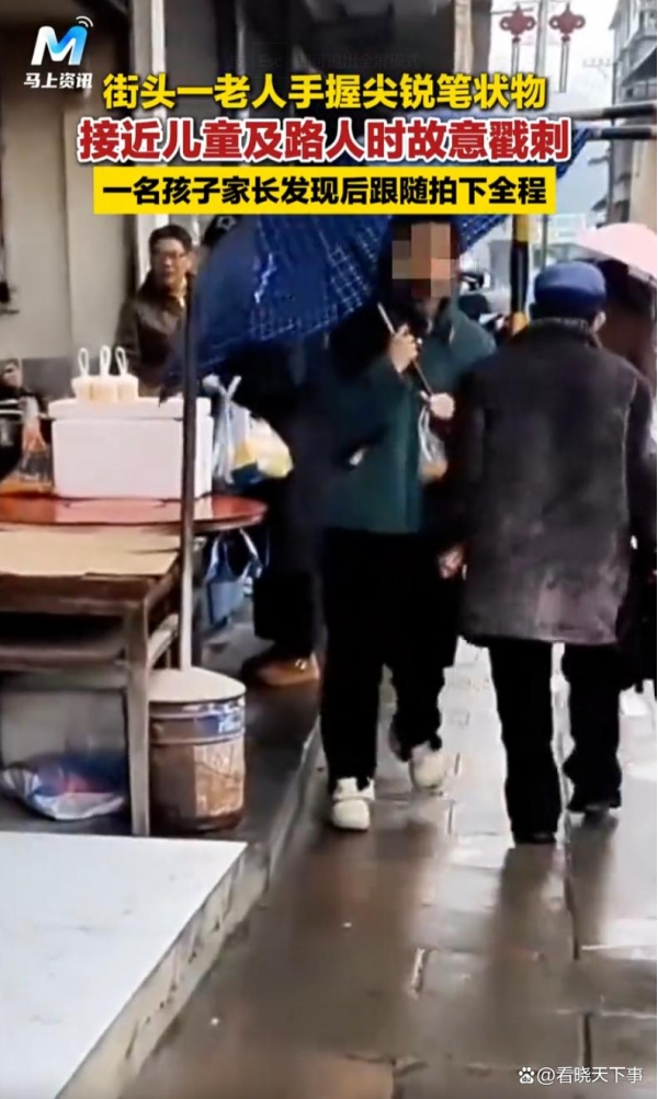 "坏人变老了!"湖北恩施,一女子走路时在街头发现一位老人手里握着一个尖锐笔状物,开始她还好奇大街上怎么拿着个东西,结果下一秒就发现老人在接近儿童及路人时故意戳刺,女子一路跟拍,网友也是越看越气