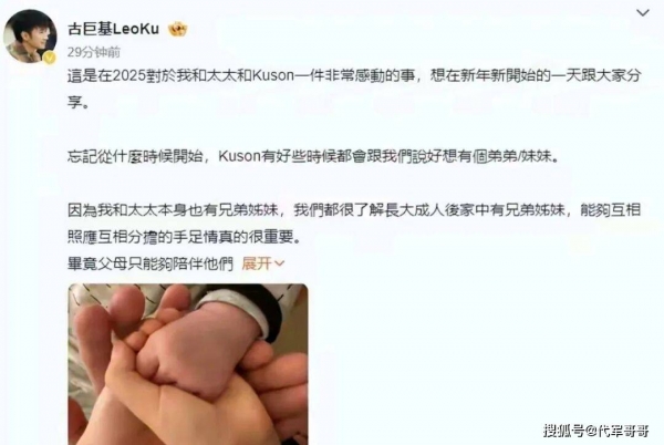 其实早在2026年元旦,古巨基就已在社交平台官宣二胎出生的喜讯,他晒出一家四口大手握小手的照片,配文透露,决定生二胎,很大程度上是源于大儿子Kuson长久以来的期盼--小家伙曾多次跟父母念叨,好想有个弟弟或妹妹陪伴自己。