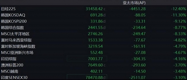 最新消息显示,日本东京股市继续大幅度下跌,日本东证指数则跌势更为猛烈,一度跌近8%且向下触发熔断机制。此外,韩国股市也在劫难逃,韩国综合指数盘跌幅超过4%,三星电子跌幅扩大至9%,是2008年以来最大跌幅。除此之外,就连台湾地区股市也受到重挫,也是近几年以来盘中罕见的跌幅。