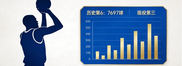杜兰特此成就绝非"靠数量堆",而是以生涯88.2%罚球命中率达成。对比历史名宿:乔丹83.5%、科比83.7%、詹姆斯73.4%。他两次入选"180俱乐部",罚球稳定是关键基石。现役球员中,他罚球命中数仅次于詹姆斯、哈登,稳居第三。