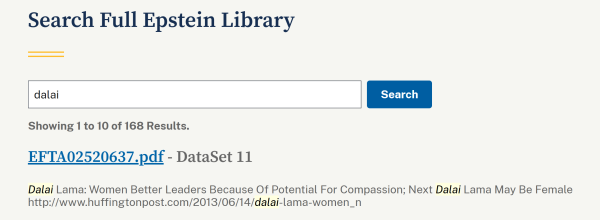 爱泼斯坦档案中,关键词"dalai"出现168次。 美国司法部网站截图