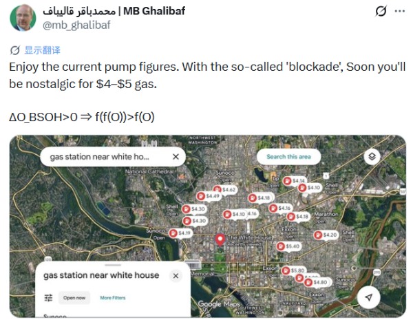 当地时间4月12日,伊朗伊斯兰议会议长卡利巴夫在社交平台发布了一张图片,图中显示了白宫附近加油站的油价。