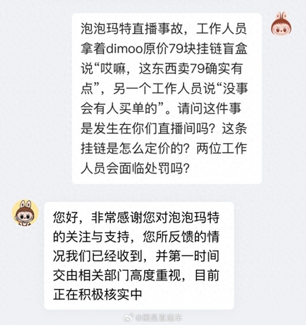 这段对话被录屏并广泛传播。对此,小编问询涉事直播间。该直播间回应称:非常感谢您对泡泡玛特的关注与支持,您所反馈的情况我们已经收到,并第一时间交由相关部门高度重视,目前正在积极核实中。