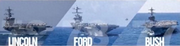 帖文称,随同其舰载机联队一同部署的"亚伯拉罕·林肯"号、"杰拉尔德·R·福特"号和"乔治·H·W·布什"号航母,共搭载了超过200架各型飞机及1.5万名海军和海军陆战队员。
