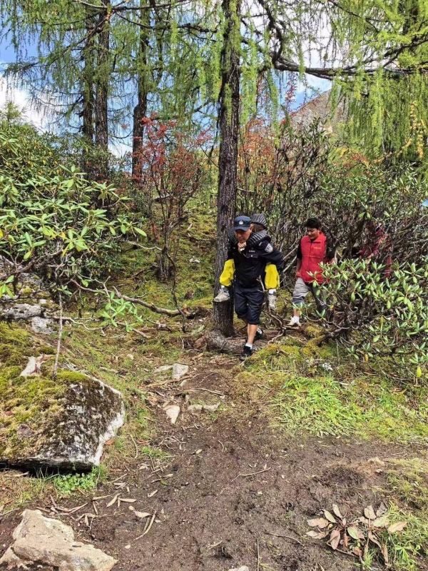 事不宜迟,仁真东周决定一行人将游客背下山,三个人轮流换着背下山。一个小时后,救援人员终于将该游客送上救护车,目前该游客身体已无大碍。