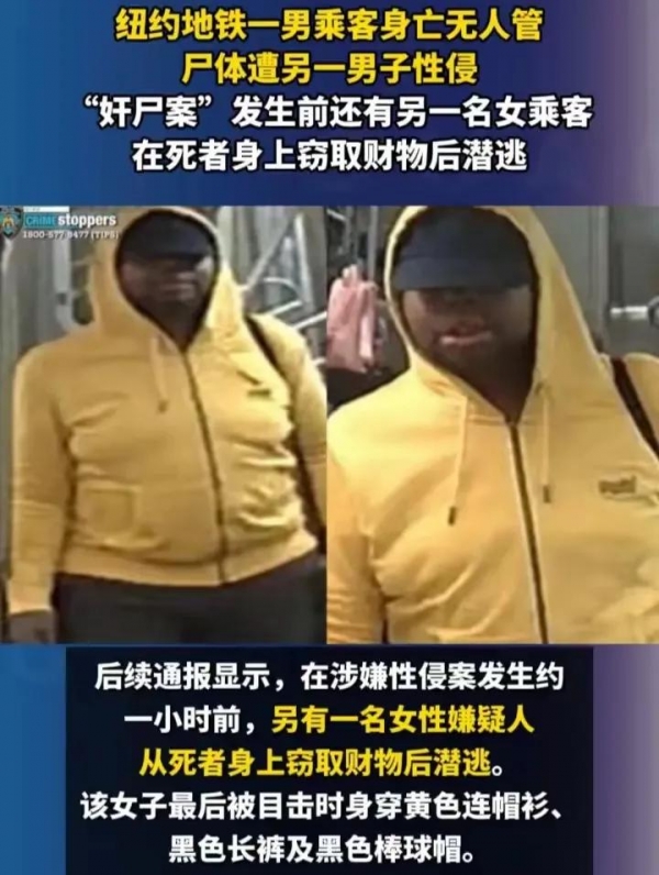 但这还不是最突破底线的,大约1小时后,出现了一个头戴蓝色棒球帽,身着黑色连帽外套、黄色连帽运动衫,穿着牛仔裤,脚蹬红白相间运动鞋,背着背包的男性嫌犯。他做出的事情,简直丧心病狂--对死者遗体实施性侵,之后大摇大摆地离开。