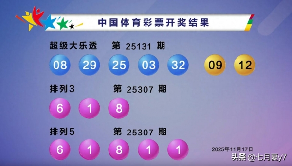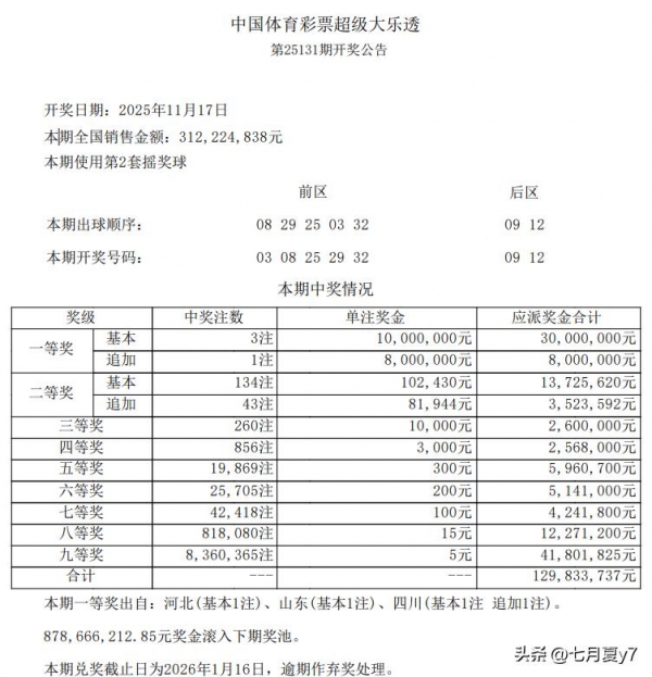 2025年11月17日开奖的大乐透第25131期,以一组热号主导的号码组合,为全国彩民送上了3注千万头奖。本期开奖号码前区为03、08、25、29、32,后区为09、12。