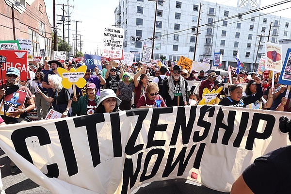 10月4日,美国洛杉矶,多个工会和移民权益组织的成员举行以"我们人民崛起--停止仇恨,停止突袭"为主题的游行和集会。 IC Photo