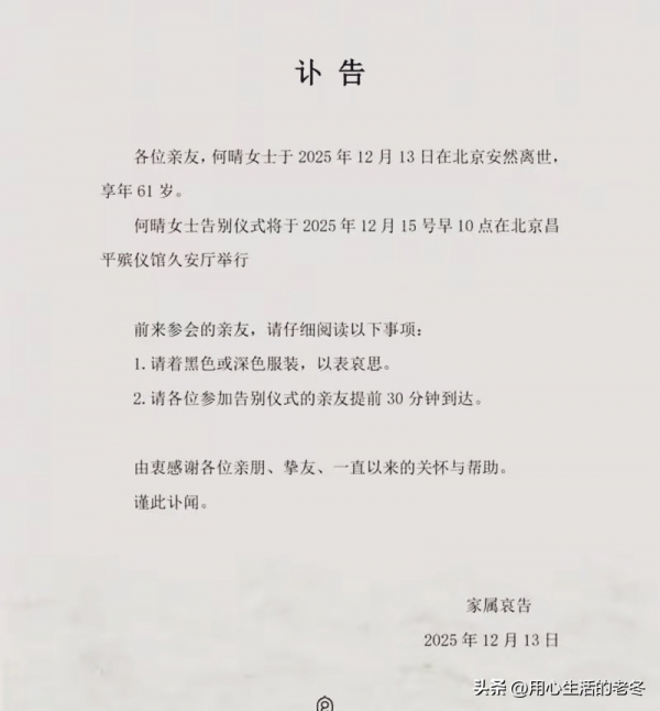 演员何晴今年12月份在北京去世,家属只在朋友圈发讣告,连告别仪式都没大张旗鼓。合作过的六小龄童、马德华都在网上表示可惜,说她的身体早就不行了。黄绮珊还曾帮她祈福,网友这才知道她生前病了这么多年。