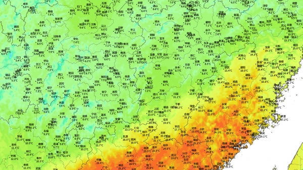随着冷空气的南下,华南也开始有了寒冷的感觉,其实从昨天下午开始,冷空气西段就已经突破了南岭的缺口进入到了广西的中北部,而当时冷空气的大部队,则陈兵南岭到武夷山一带。广东、福建、广西东南部一带,在锋前增温作用下,气温大幅度攀升。广州温度升到了26.7度,番禺升到了27.6度,广西岑溪25.9度,福建华安和大田也升至25.4度,这种温度已经几乎是初夏的体感了!