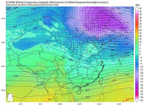 北方一股实力很强的冷空气,在跨年期间在北方集聚实力,依目前的预报来看,不排除发展为寒潮的可能性。并且这股冷空气的前锋会在跨年期间南下,这时候就会与南方的暖湿气流正面交锋。而这种冷暖空气的对决,正是产生大范围降雨和降雪,以及剧烈降温的经典天气配置。